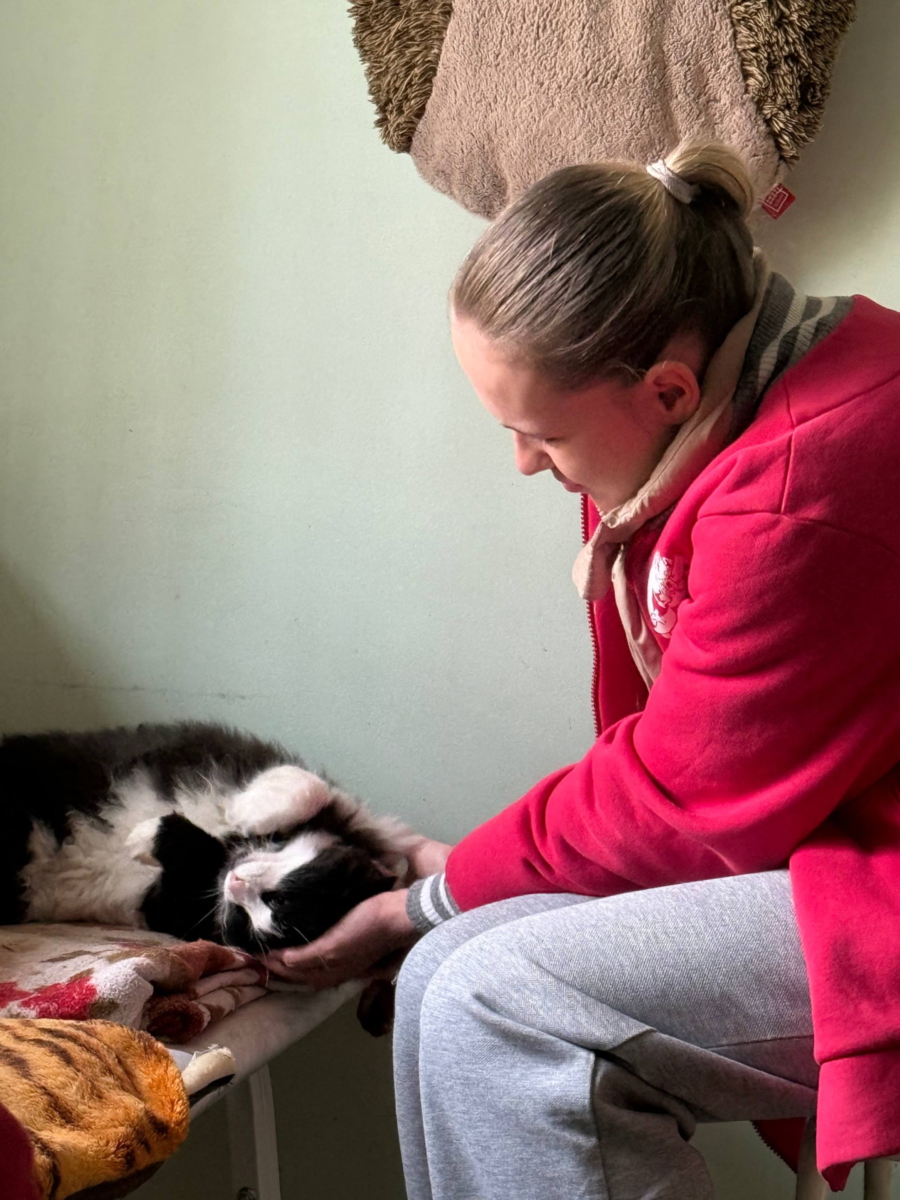 «Сегодня я здесь перегладила, наверное, всех кошек. Они такие милые, гордые и, одновременно, абсолютно беззащитные. Мурчать начинают сразу, как только возьмешь их на руки, пушистые комочки счастья. Никогда не смогу понять, как у кого-то поднимается рука выбросить на улицу такую преданную и ласковую душу. Мы приезжаем сюда не первый раз, ведь приют не имеет государственного финансирования, и живет только на пожертвования неравнодушных людей. Наша задача – сделать количество таких людей большим!», - подчеркнула студентка БкУП-400 Слюсаренко Виктория.