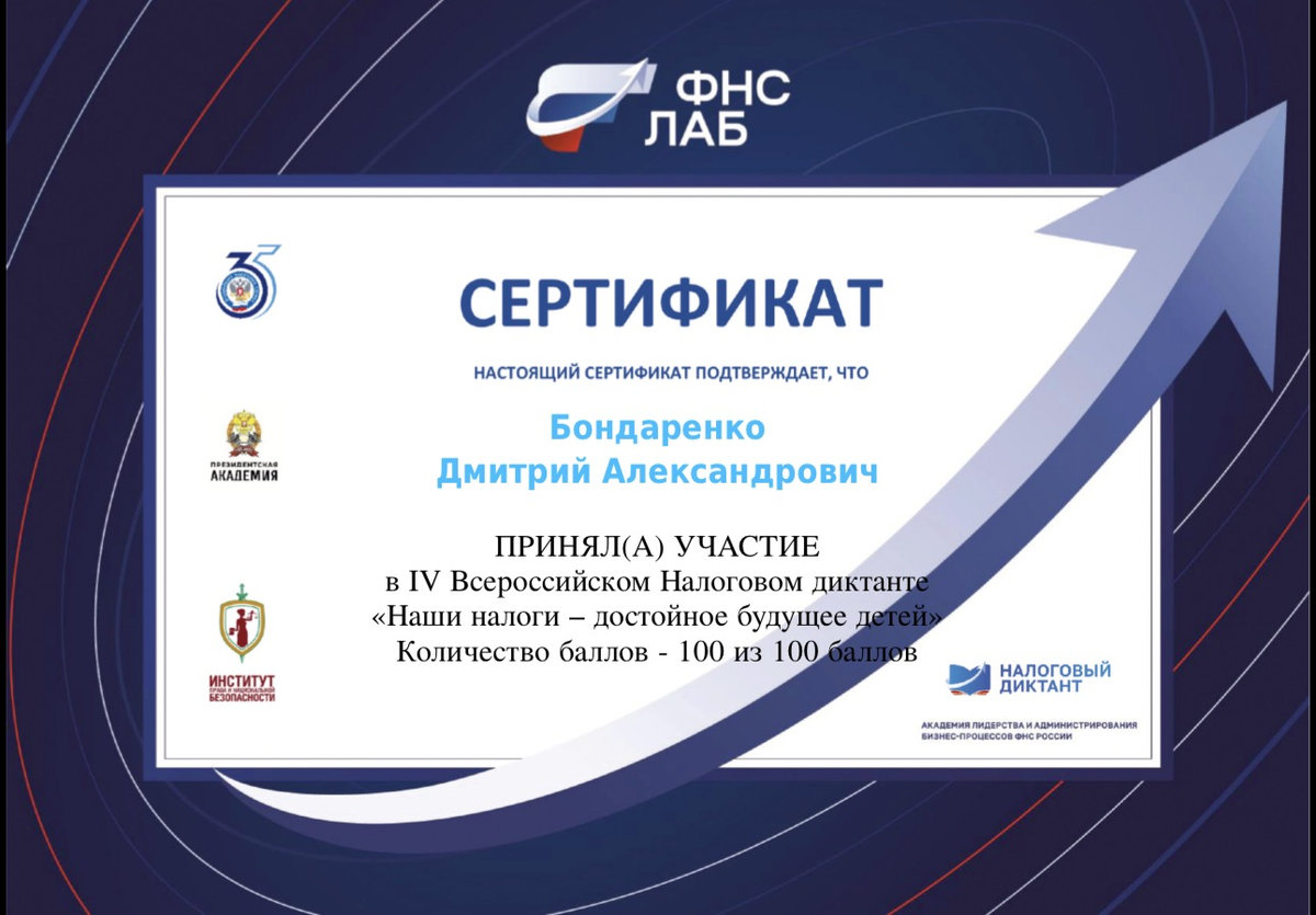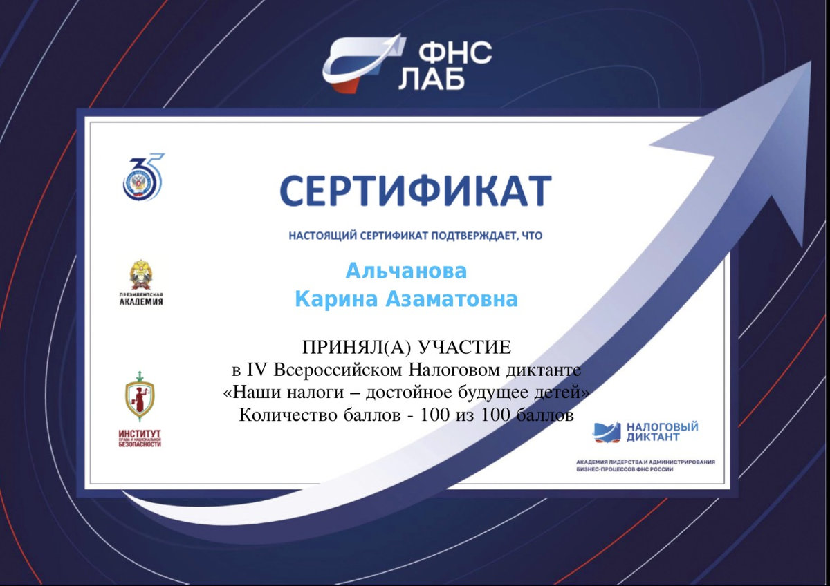 По результатам прохождения налогового диктанта студенты набрали от 70 до 100 баллов. Максимальный результат получили Касмина Лилия, Костяков Артем, Бондаренко Дмитрий, Пушкина Яна, Альчанова Карина, Вилкова Полина.