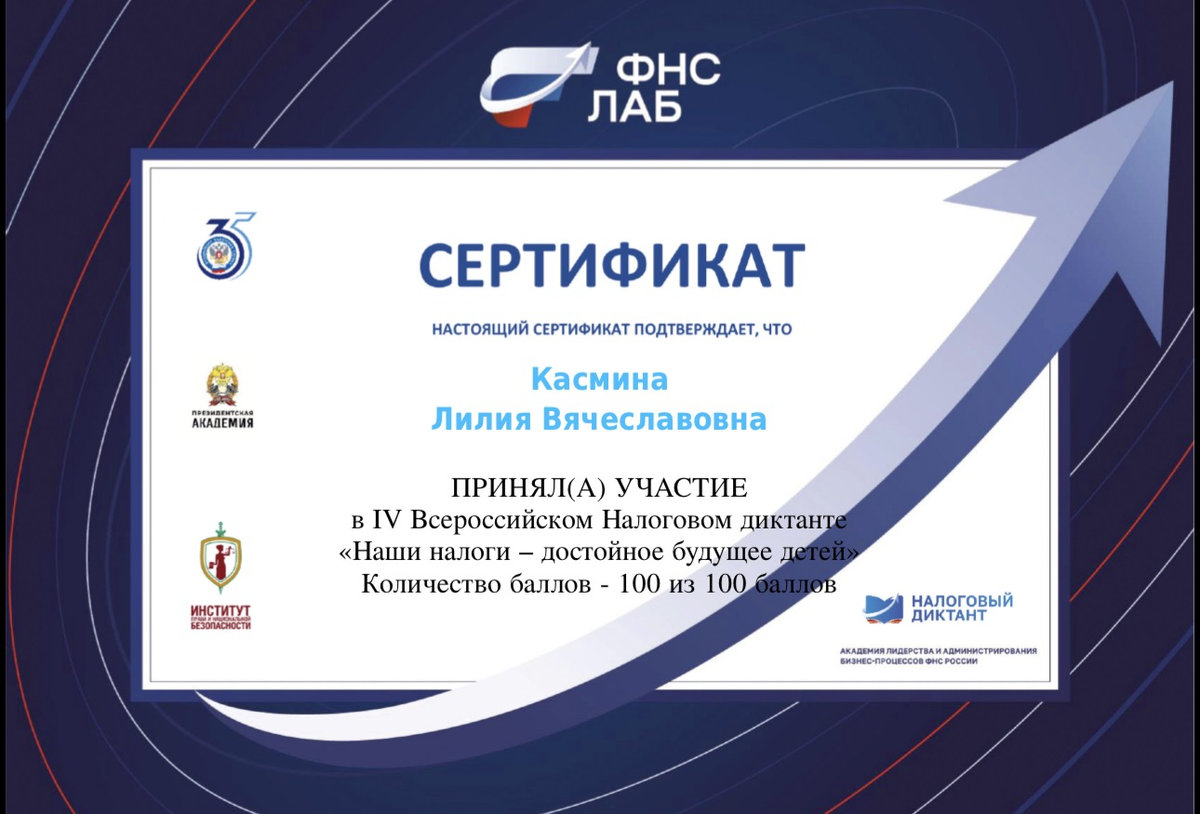 Студентка 5 курса ПНБ-502 Касмина Лилия, получившая максимальный балл по итогам прохождения Всероссийского налогового диктанта, поделилась впечатлениями: «Это не только приятный результат, но и отличная проверка собственных знаний. Диктант охватывает ключевые аспекты налогового права, которые должен знать каждый юрист. Задания были сложными, но исключительно практико-ориентированными. Рекомендую всем студентам - юристам — это хорошая проверка вашей готовности к реальной работе».