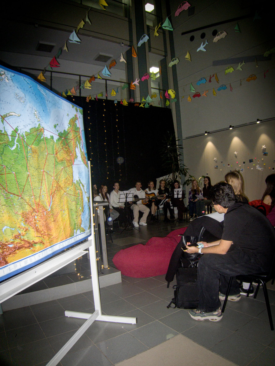 Настоящим открытием для всех участников стало яркое душевное выступление Юлии Алексеевны Дроздовой (к. соц. н., доцент, декан факультета ГМУ), которая прочла стихотворение собственного сочинения, а также под собственный аккомпанемент на гитаре исполнила песню, которая была написана ей совместно с друзьями в студенческие годы. Все присутствующие прониклись красивым голосом Юлии Алексеевны, а также задумались о вечных темах любви, молодости, путешествий и дружбы, затронутых в написанных ей строках.
