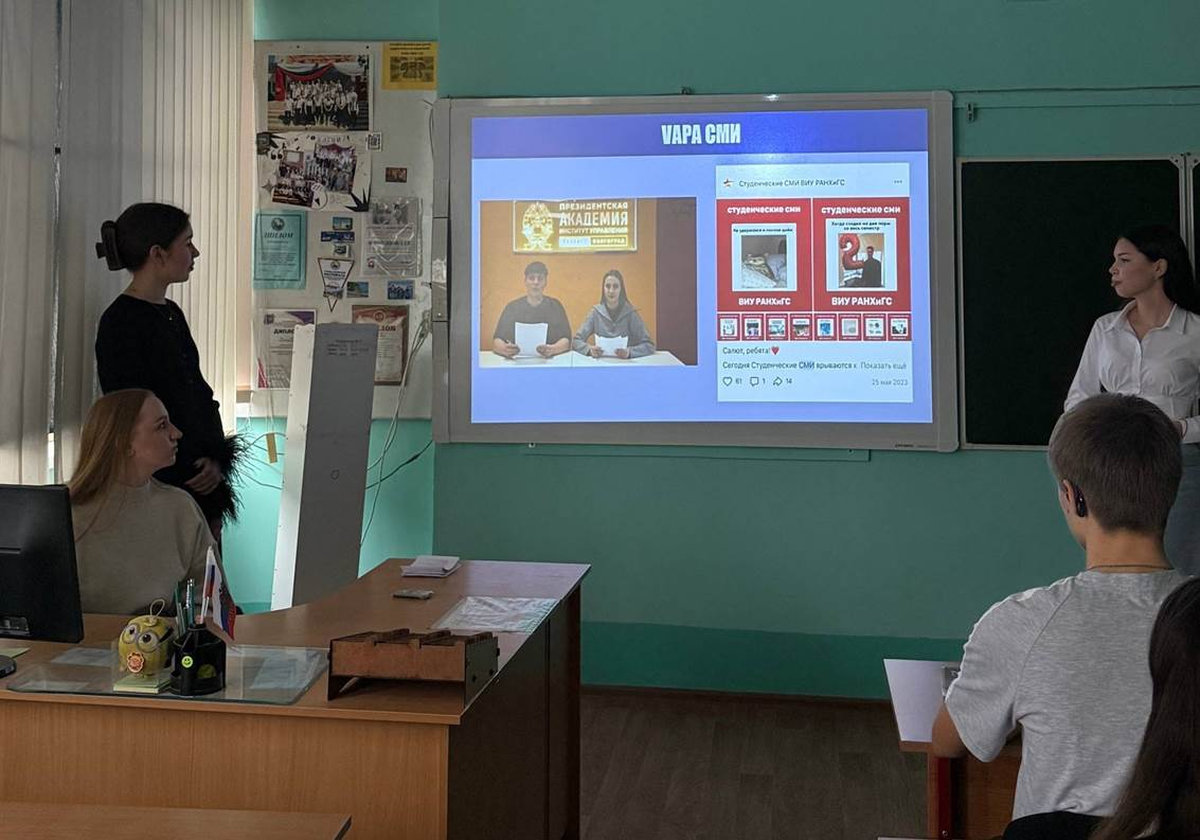 Группа четверокурсников направления "Социология" Волгоградского института управления – филиала Президентской академии провела профориентационный урок для учащихся 10–11 классов Лицея № 11 г. Волгограда. Основная цель встречи — помочь старшеклассникам разобраться в современных направлениях высшего образования и осознанно подойти к выбору будущей профессии. Мероприятие организовано в рамках реализации профориентационного проекта "Твой выбор" по дисциплине "Обучение служением" под руководством преподавателя кафедры социологии, общей и юридической психологии Зудовой Екатерины Васильевны.