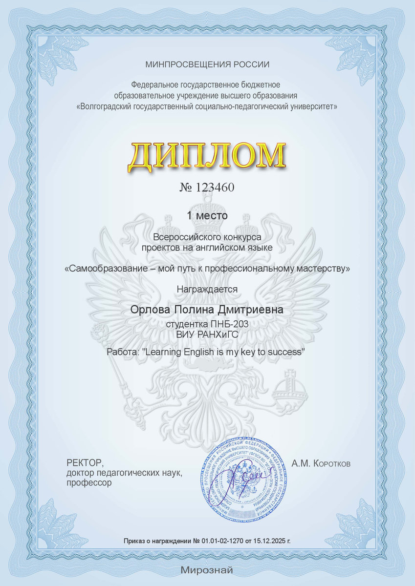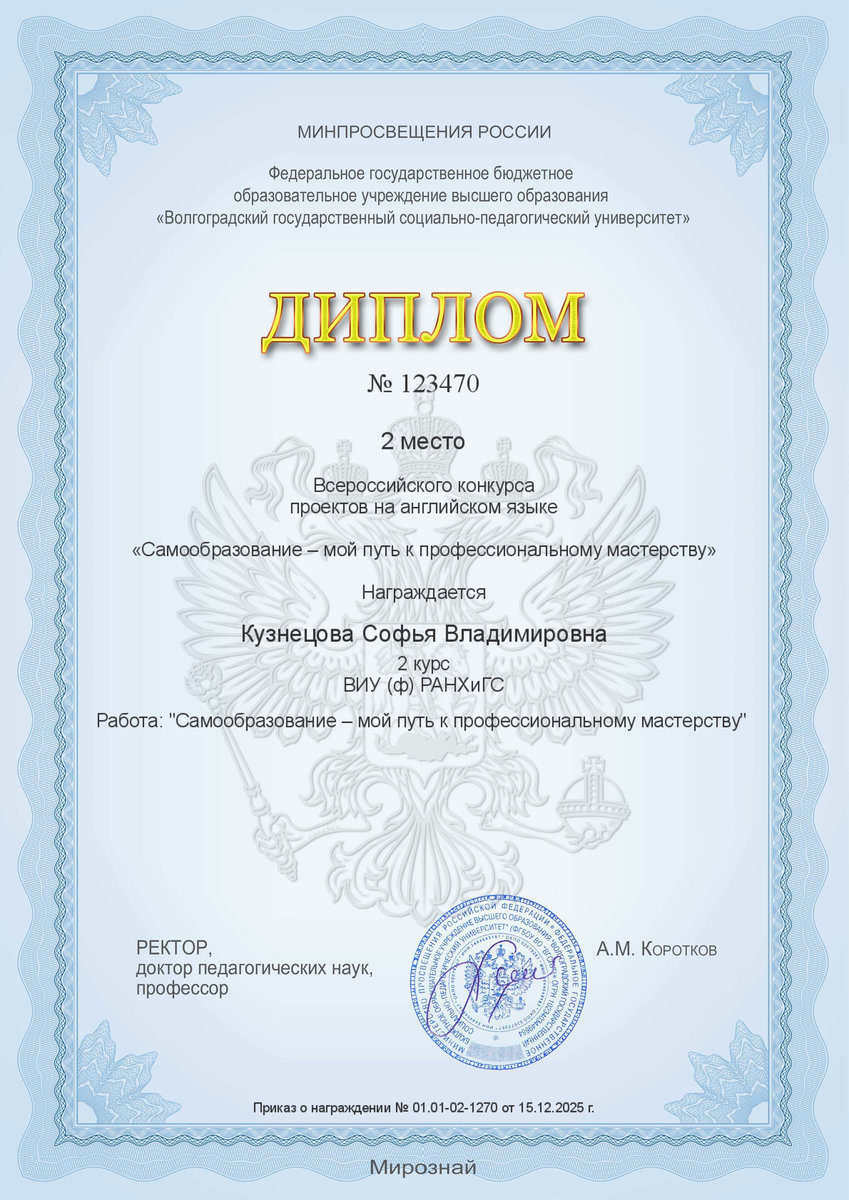 Студенты юридического факультета Волгоградского института управления – филиала РАНХиГС заняли призовые места во Всероссийском конкурсе проектов на английском языке «Самообразование – мой путь к профессиональному мастерству».