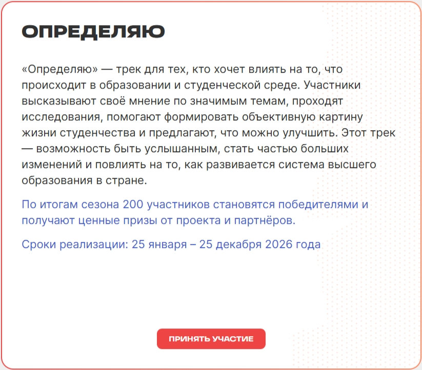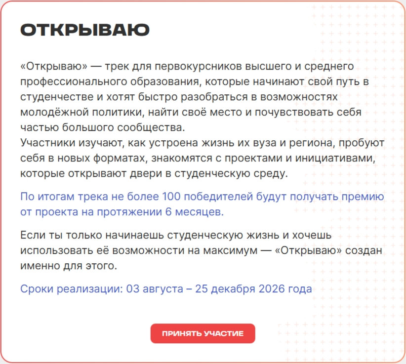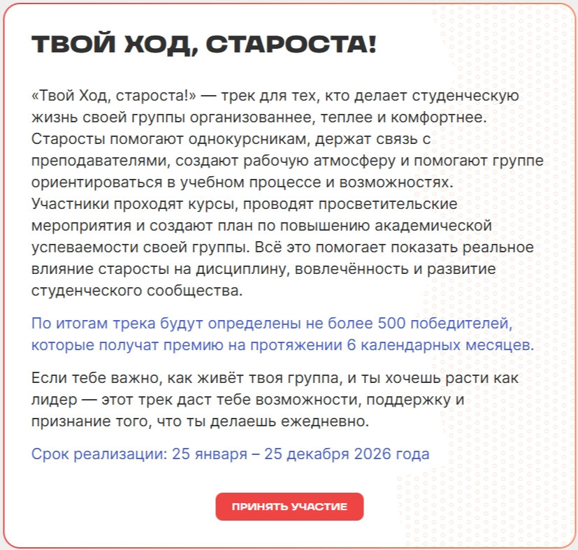 Твой Ход — это социальный лифт для тех, кто хочет влиять на развитие страны.Ты получаешь не просто опыт или призы, а реальный старт в управлении молодёжной повесткой страны.
