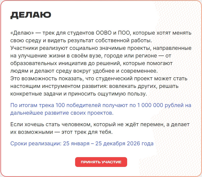 Конкурс состоит из пяти треков. Каждый трек включает онлайн-этапы, практические задания и защиту проектов. Конкурсные испытания проходят с 25 января по 25 августа 2026 года.