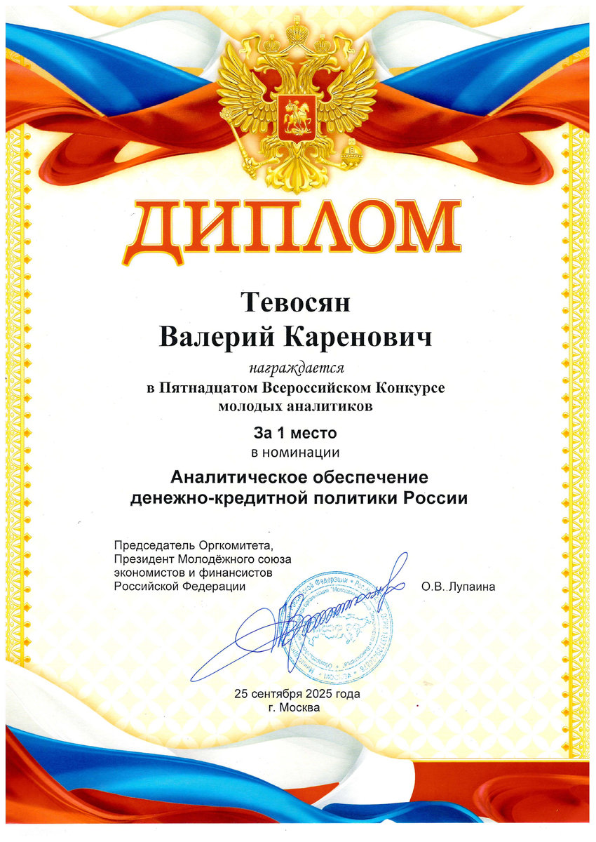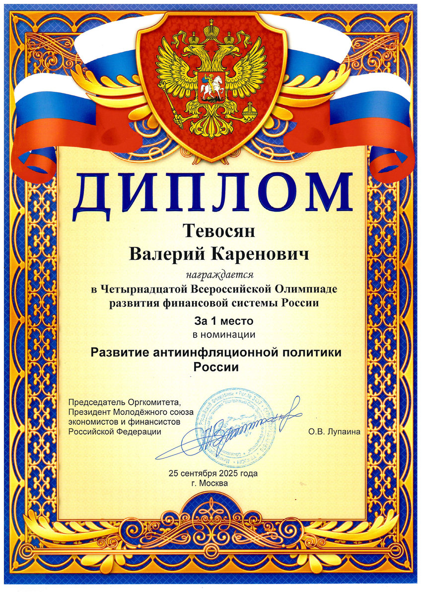 Тевосяна Валерия Кареновича – 1 место в номинации «Развитие антиинфляционной политики России» Четырнадцатой Всероссийской Олимпиады развития финансовой системы России; 1 место в номинации «Аналитическое обеспечение денежно-кредитной политики России» Пятнадцатого Всероссийского Конкурса молоды аналитиков.