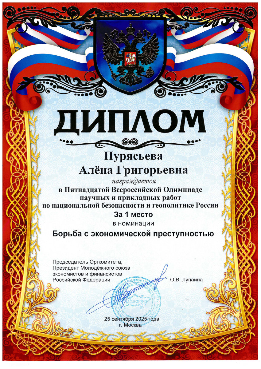 Пурясьеву Алёну Григорьевну – 1 место в номинации «Борьба с экономической преступностью» Пятнадцатой Всероссийской Олимпиады научных и прикладных работ по национальной безопасности и геополитике России;