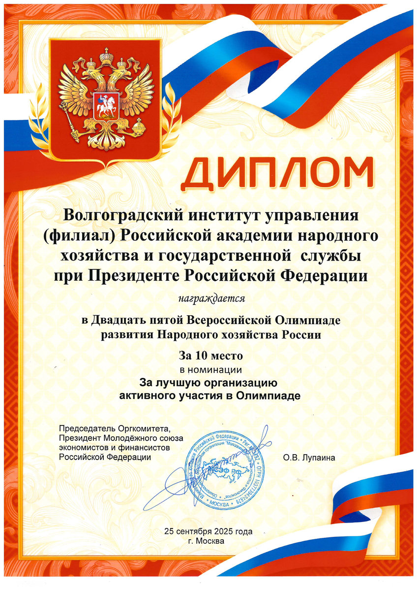 Волгоградский институт управления – филиал Президентской академии награжден дипломом за лучшую организацию активного участия в Олимпиаде.